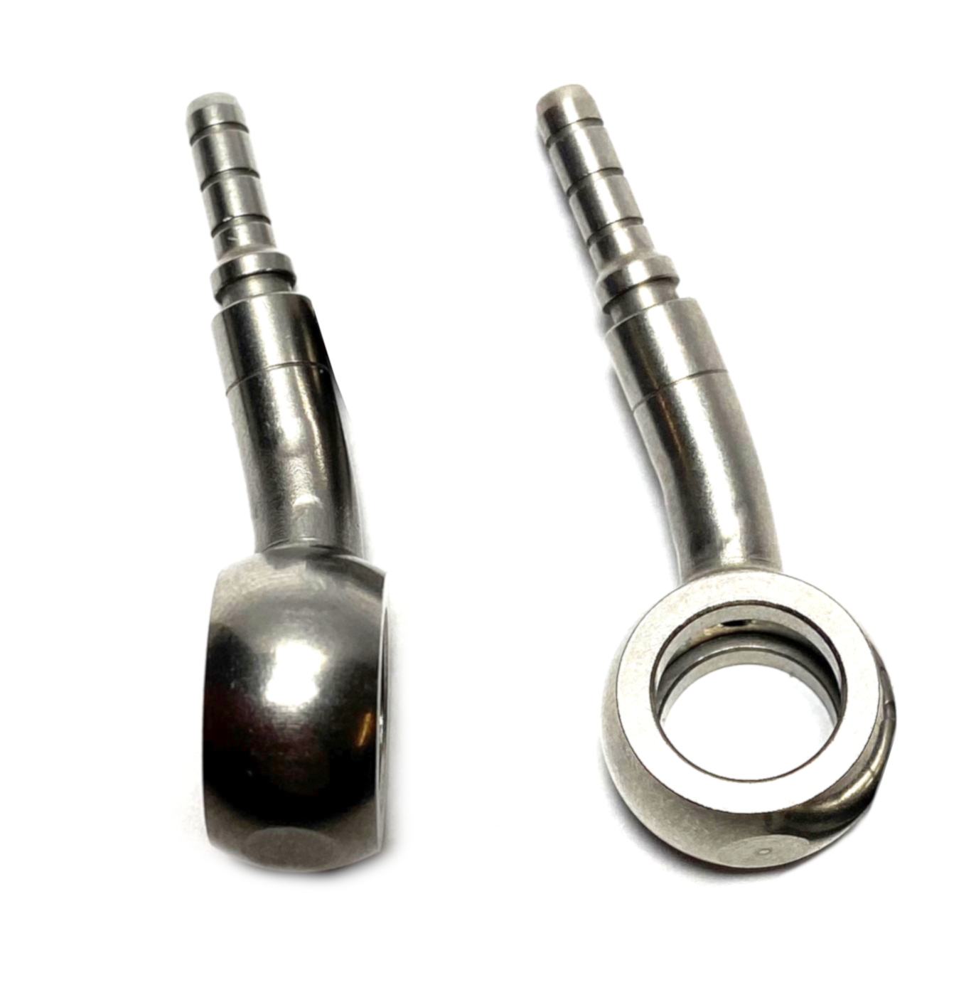 Ruostumaton banjoliitin. Liitinreiän halkaisija 10mm, letkulähdön kulma 20° ylöspäin ja 20° vasemmalle.
