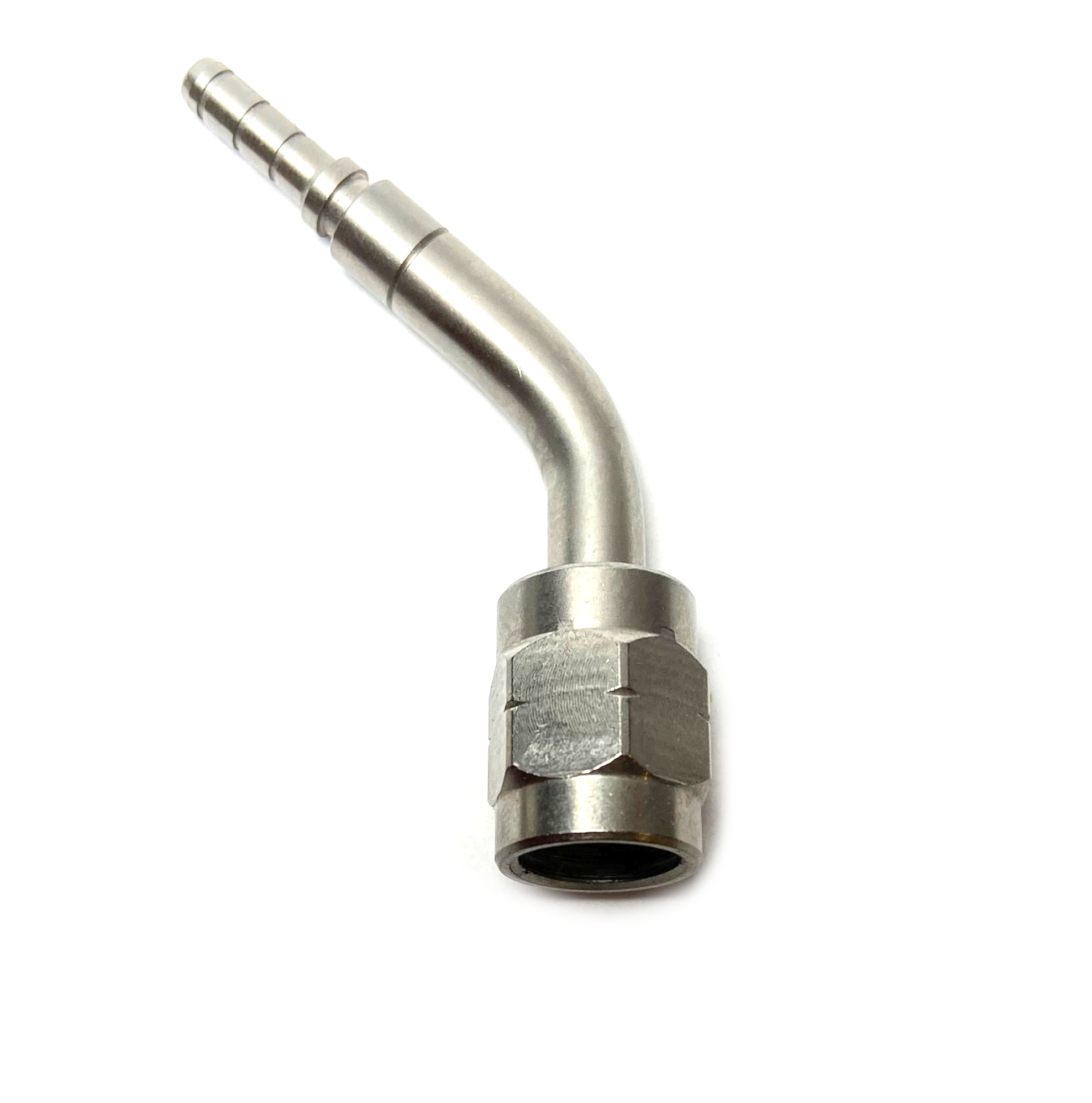 Ruostumaton jarruletkun liitin. Irtomutteri ja 45 asteen kulma. Liitinpäässä kartiokallistukset sisään ja ulospäin.