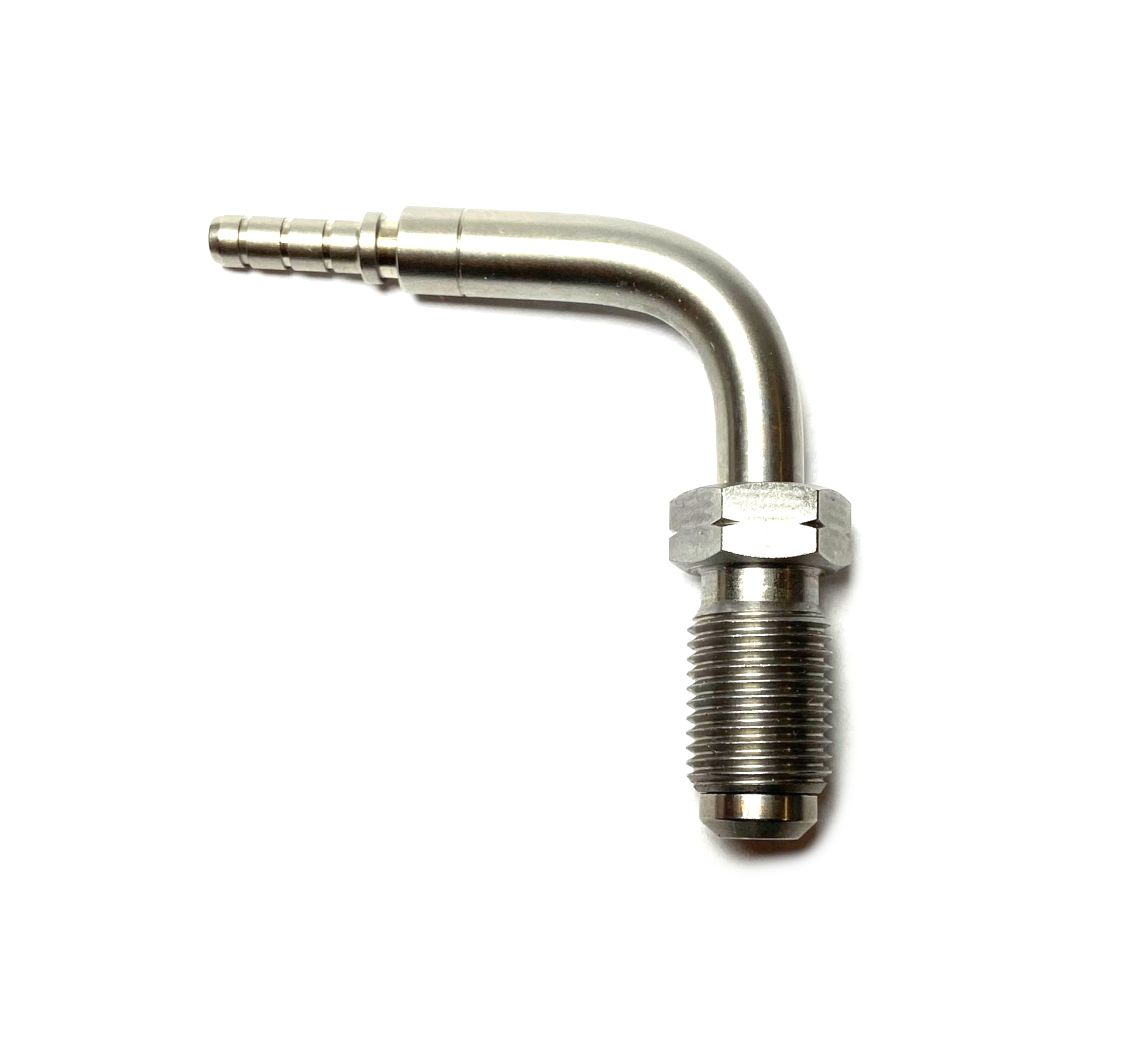 Ruostumaton jarruletkun liitin. Irtomutteri ja 90 asteen kulma. Uros ja naaras tiivistyskartiot.