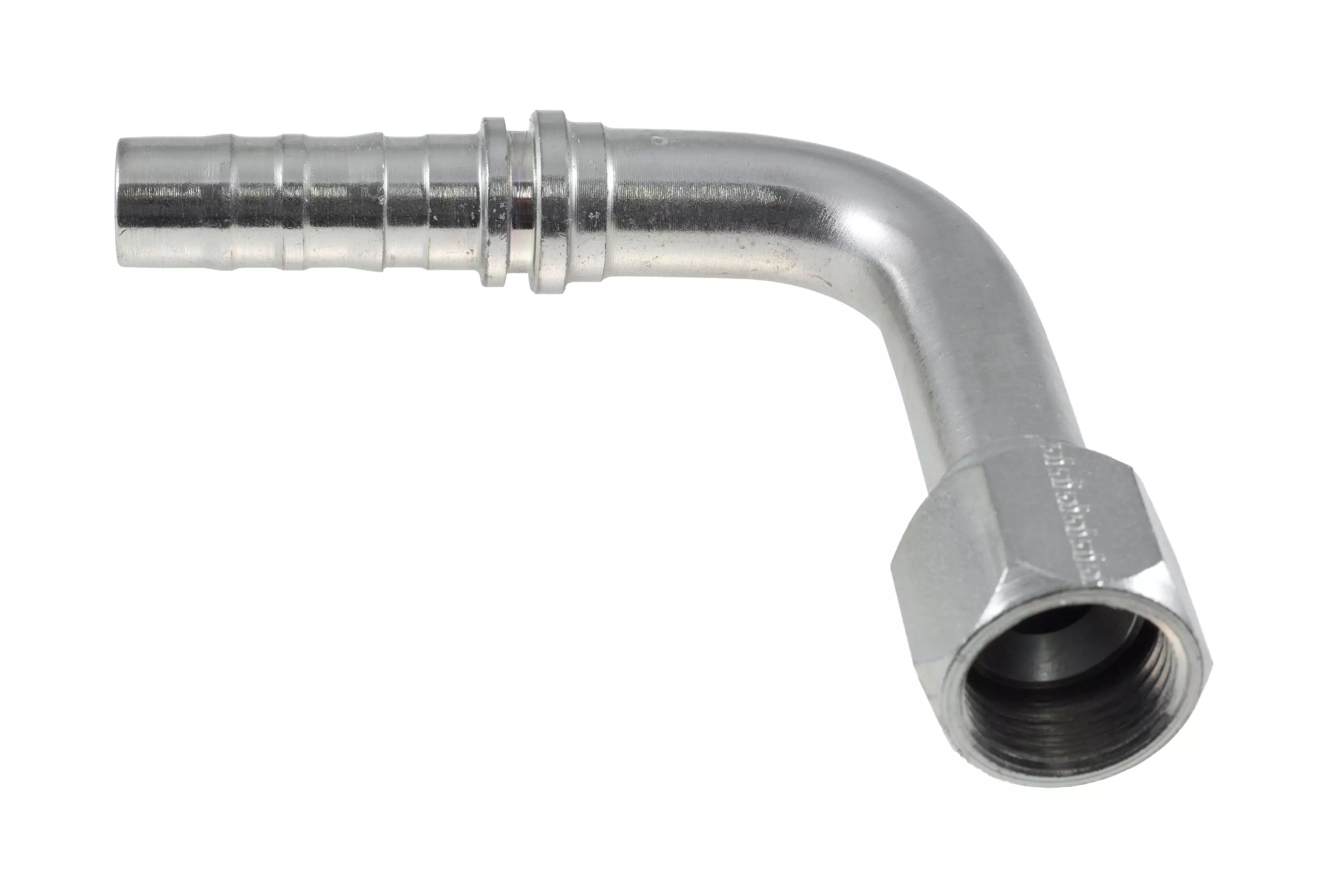 UNF-kierteinen korkea liitin spiraaliletkuille, 90 asteen kulma, JIC tiivistys, sisäkierre UNF 1 1/16"-12, letkukara 3/4" Lapin Pultista myös valmiit letkuasennelmat, ota yhteyttä asiakaspalveluumme!