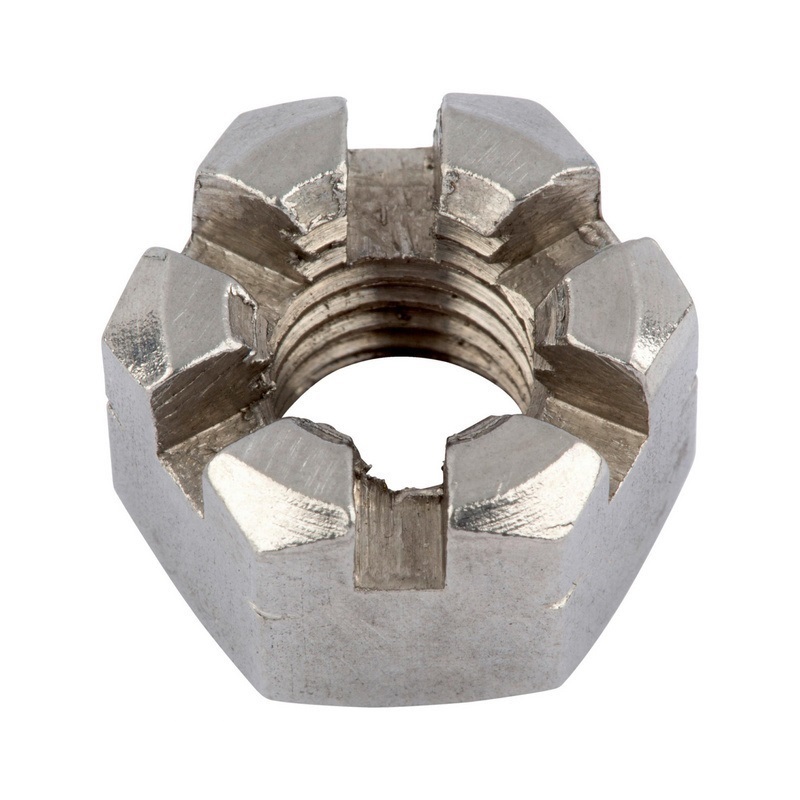Kruunumutteri pinnoittamaton hienokierteinen din935, sokalla lukittavaksi.