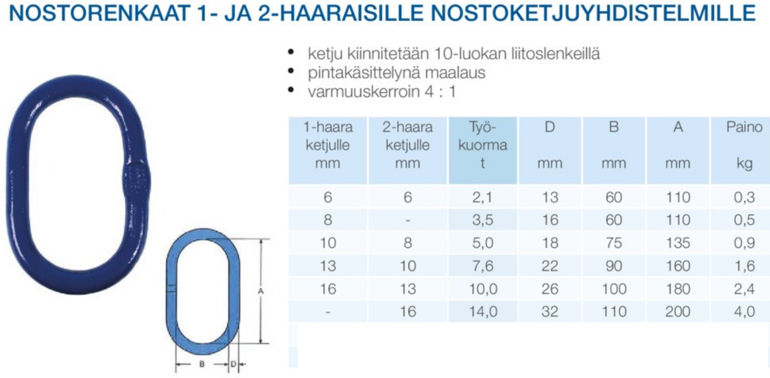 - Vakiokokoinen nostorengas 10-luokan nostoketjuyhdistelmiin.
