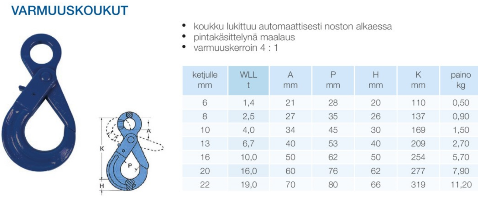 - Varmuuskoukku lukittuu automaattisesti noston alkaessa.