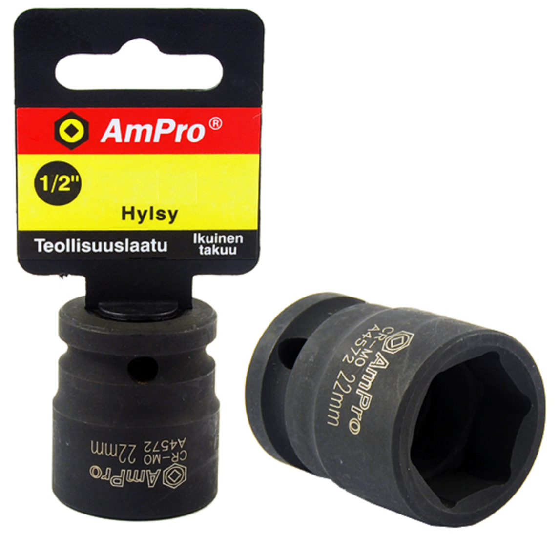 Teollisuuslaatuinen AmPro 1/2" voimahylsy. Materiaali korkealuokkaista kromi-molybdeeni-terästä. Elinikäinen takuu materiaali- ja valmistusvirheiden osalta. Valitse sopiva koko.