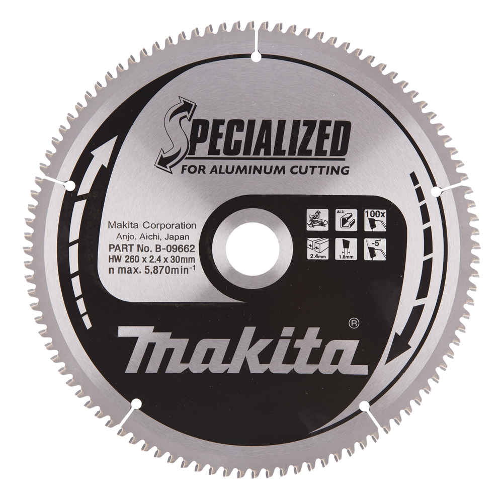 Specialized pyörösahanterä 260 mm halkaisijalla ja Z-100 hammastuksella alumiinin sahaamiseen. Terä soveltuu pöytä- ja jiirisahoilla käytettäväksi. Terän hampaan leveys 2,3 mm ja reiän halkaisija 30 mm.