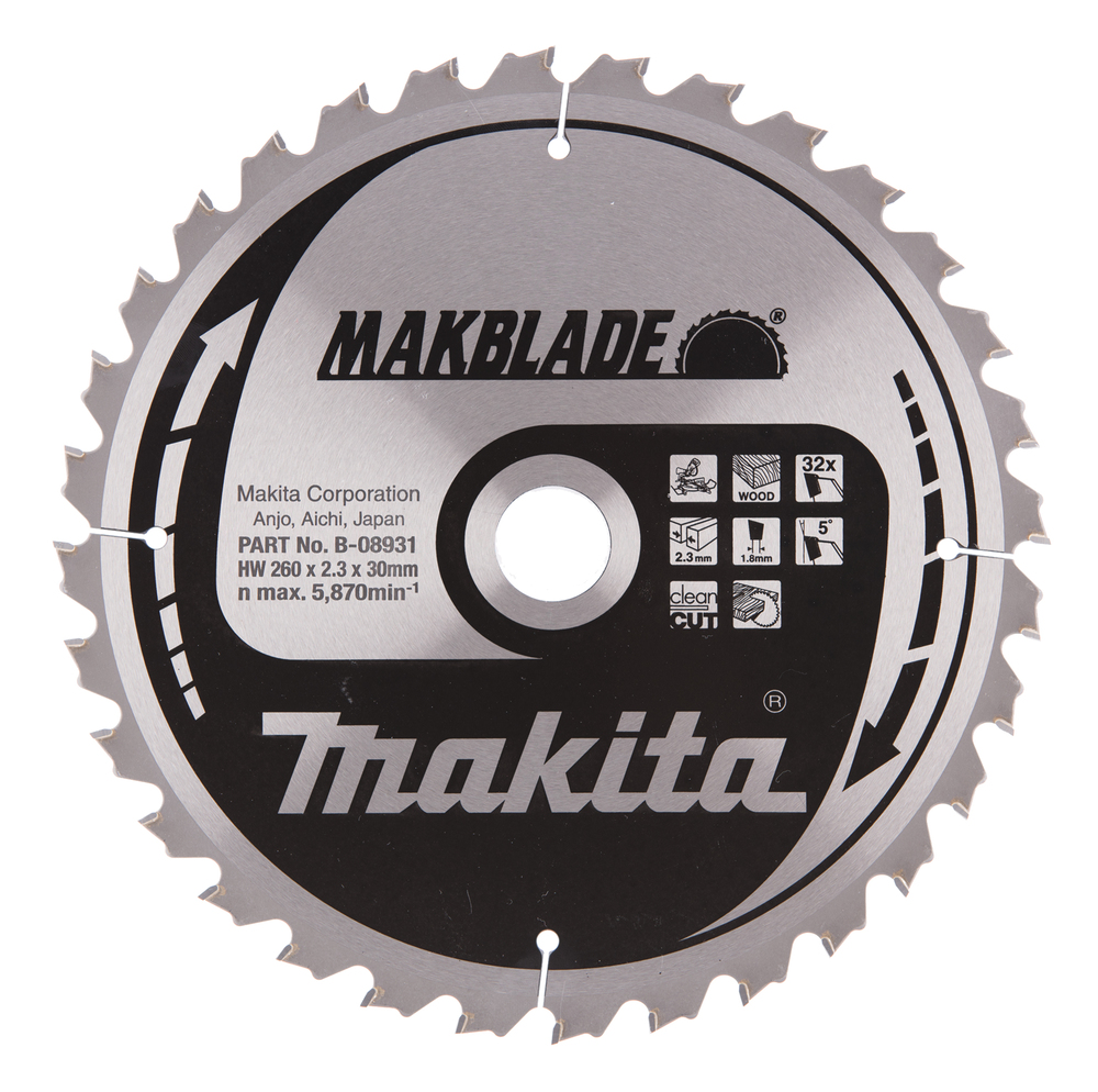 Makblade pyörösahanterä 260mm halkaisijalla ja Z-32 hammastuksella puun nopeampaan ja karkeaan sahaamiseen. Terä soveltuu pöytä- sekä jiirisahoilla käytettäväksi. Terän hampaan leveys 2,3mm ja reiän halkaisija 30mm.