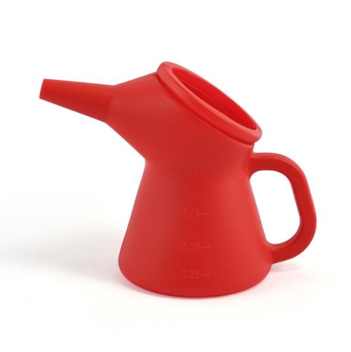 Punaisen värinen kaatokannu on valmistettu Suomessa. Erinomainen lisäämään oljyä pieniin koneisiin kuten ruohonleikkuri tai auton pissapoikaan.