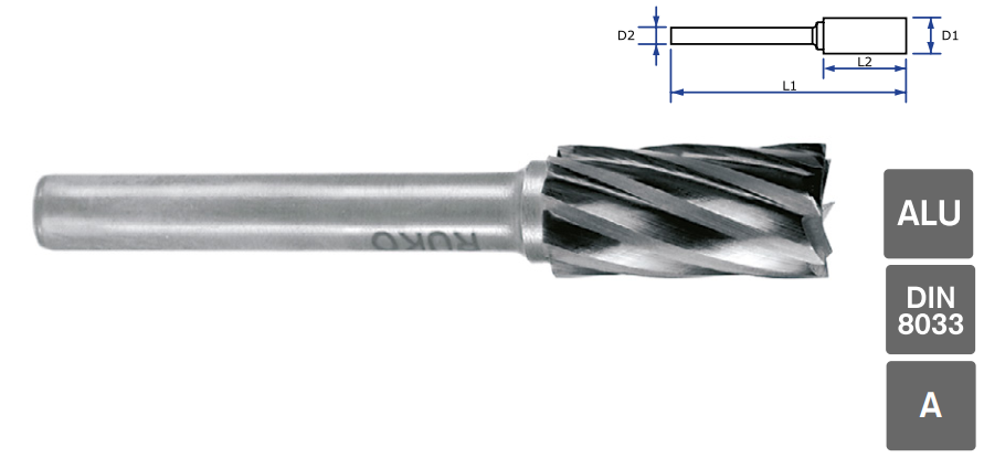 RUKO pyörivä DIN 8033 kovametalliviila. Lieriö otsaleikkuulla, muoto A. Soveltuu alumiinille, messingille, kuparille, sinkille ja muoveille.
