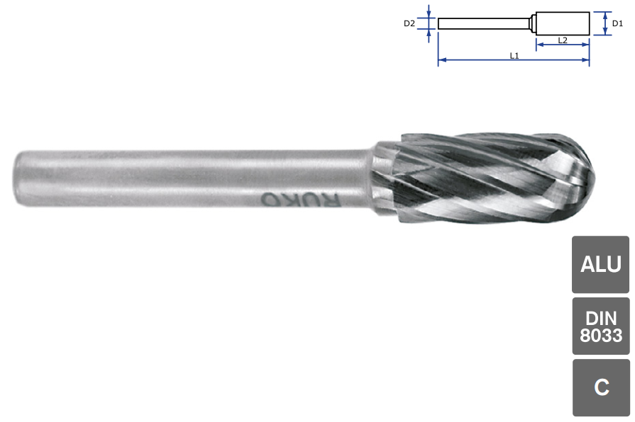 RUKO pyörivä DIN 8033 kovametalliviila. Pyöristetty lieriö, muoto C. Soveltuu alumiinille, messingille, kuparille, sinkille ja muoveille.