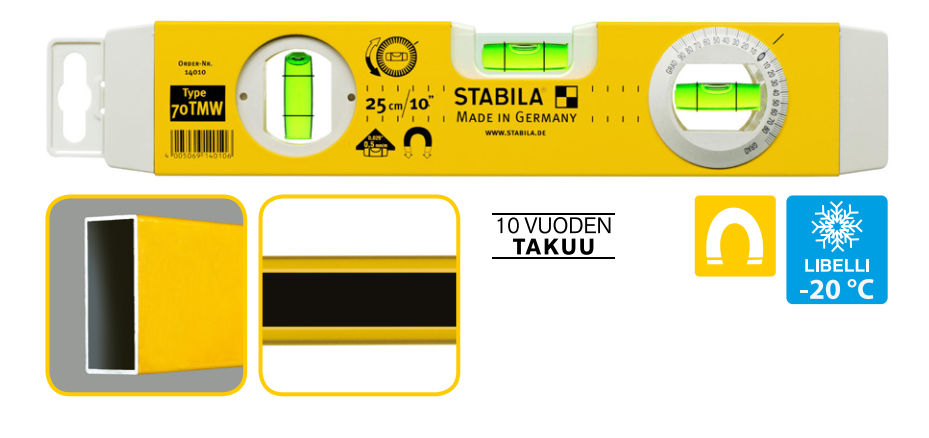 STABILA Torpedo astevesivaaka 70TMW magneetilla. Kevyt, alumiinen profiili. Magneettinauha, muoviset päätytulpat. 1 vaakalibelli ja 1 pystylibelli ja yksi säädettävä pystylibelli. Mittaustarkkuus normaalissa asennossa 0.5 mm/m
