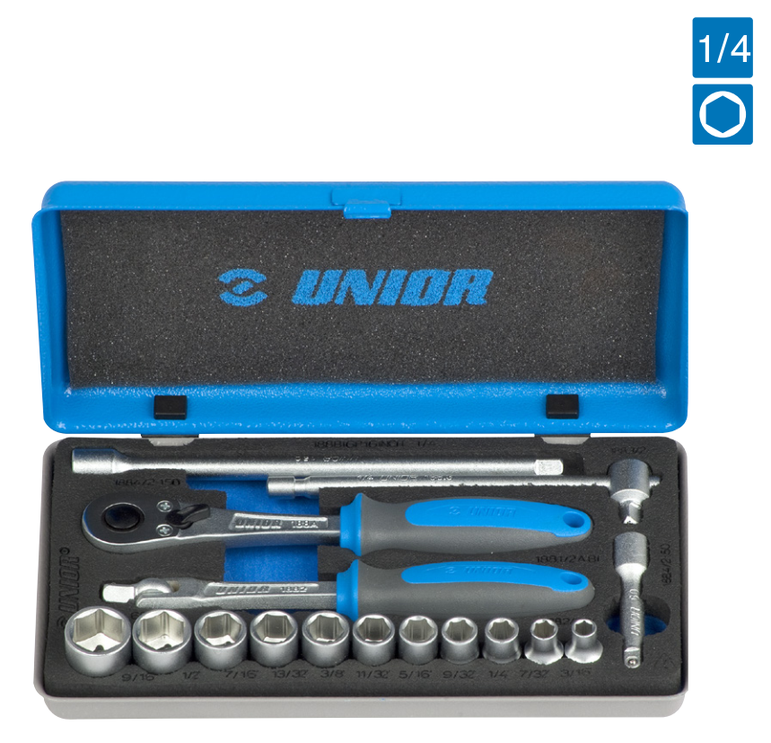 Euroopassa valmistettu UNIOR 1/4” hylsysarja peltirasiassa, 6-kulmaiset hylsyt, 16-osainen. Kromivanadiumteräksestä, taottu ja karkaistu. Elinikäinen takuu materiaali- ja valmistusvirheiden osalta.