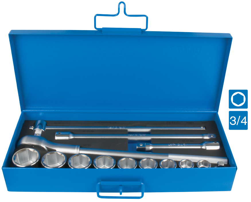 Euroopassa valmistettu UNIOR 3/4” hylsysarja peltirasiassa, 6-kulmaiset hylsyt, 14-osainen. Kromivanadiumteräksestä, taottu ja karkaistu. Elinikäinen takuu materiaali- ja valmistusvirheiden osalta.