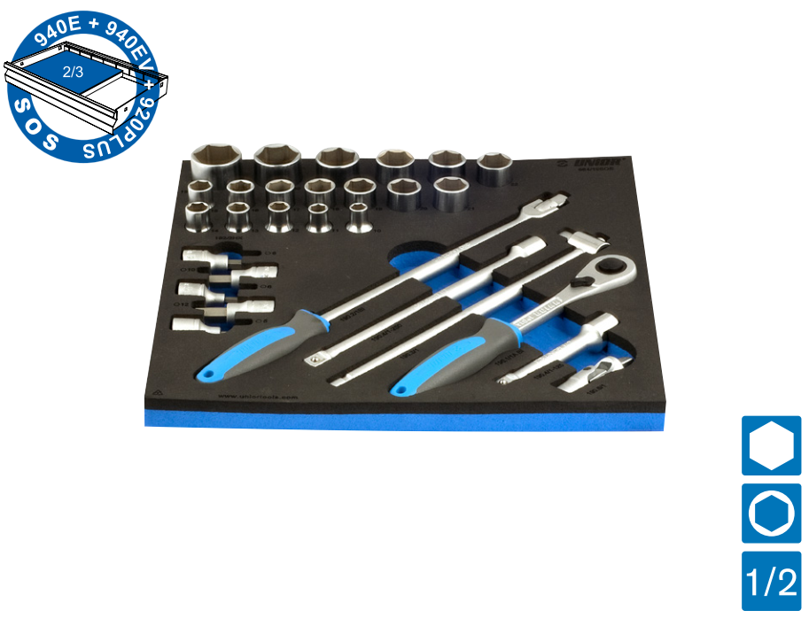 Euroopassa valmistettu UNIOR 1/2" hylsysarja työkaluvaunuihin, 29-osainen. Karkaistuilla työkaluilla elinikäinen takuu materiaali- ja valmistusvirheiden osalta.