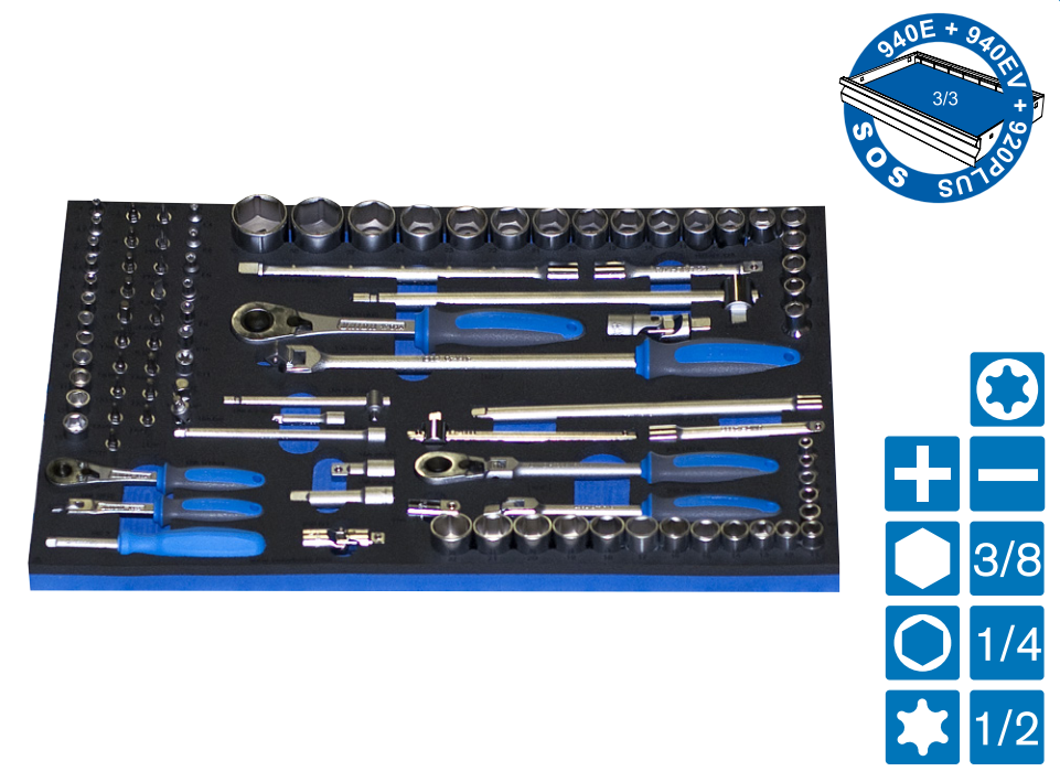 Euroopassa valmistettu UNIOR 1/4” + 3/8” + 1/2” hylsytyökalusarja työkaluvaunuihin, 96-osainen. Karkaistuilla työkaluilla elinikäinen takuu materiaali- ja valmistusvirheiden osalta.