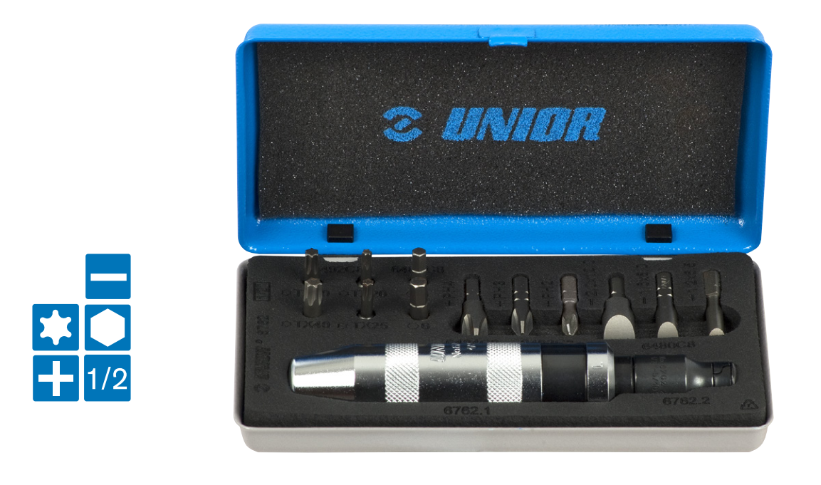 UNIOR 14-osainen iskuruuvitalttasarja. Voidaan käyttää 5/16" iskumeisselin kärkiä tai 1/2" tavallisia voimahylsyjä.