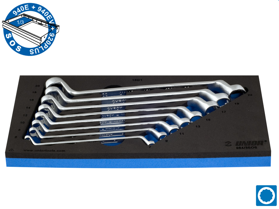 UNIOR polvilenkkiavainsarja - 8-osainen - Sarja 964/3 - Polvilenkissä kaksi eri kokoa - 180/1 sarjan polvilenkit: 6x7mm - 8x9mm - 10x11mm - 12x13mm - 14x15mm - 16x17mm - 18x19mm - 20x22mm - Valmistettu kromivanadiinista - Taottu ja täysin karkaistu - Työkalualustassa, mitat 188mm x 364mm x 30mm - Valmistettu Euroopassa - Elinikäinen takuu materiaali- ja valmistusvirheiden osalta. Takuuaika päättyy, kun tuotteesta tulee käyttökelvoton muusta syystä kuin valmistus- tai materiaalivian vuoksi.