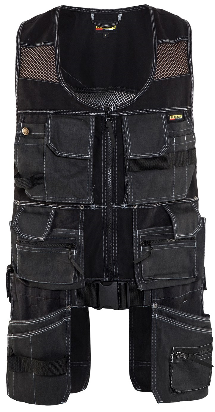 - Erittäin moderni riipputaskuliivi, jossa on useita eri taskuja työkaluille ja tarvikkeille.