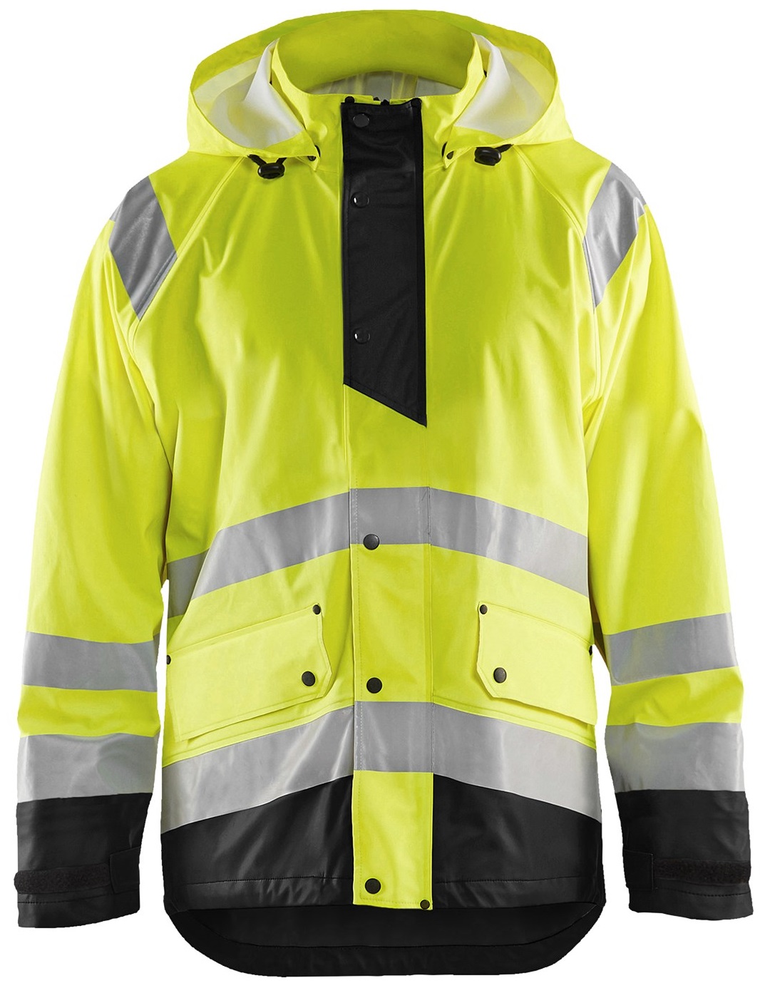 Huomiovärinen sadetakki, jossa pidennetty selkäosa ja kiristysnauha helmassa. Vahva ja kestävä kangas, vaikka se tuntuukin kevyeltä. Veden- ja tuulenpitävä, liimatut saumat. Säädettävä ja irrotettava huppu, etutaskut ja kaksisuuntainen vetoketju, joka tulee ylös kaulukseen asti. Tarralla säädettävät hihansuut. Sertifioitu EN 343, luokka 3.1 ja EN ISO 20471 luokka 3.