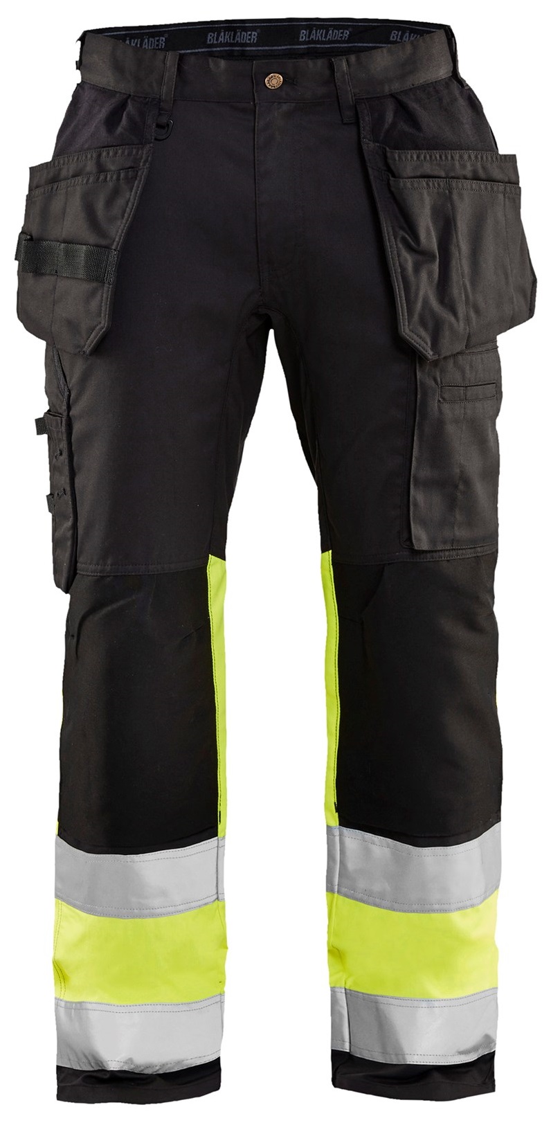 Kevyet, joustavat ja kestävät riipputaskuhousut tarkkaan mietityillä yksityiskohdilla. Stretch-kangasta on haaroissa, takapuolella polvissa liikkuvuuden parantamiseksi. CORDURA®-stretch polvisuojataskut lisäävät mukavuutta polvilla työskenneltäessä. Paljon toiminnallisia taskuja kuten puhelintasku sisäpuolella, kolmiosaiset riipputaskut, mittatasku, jossa puukonpidike ja kynätasku. Sertifioitu EN ISO 20471 luokka 1.