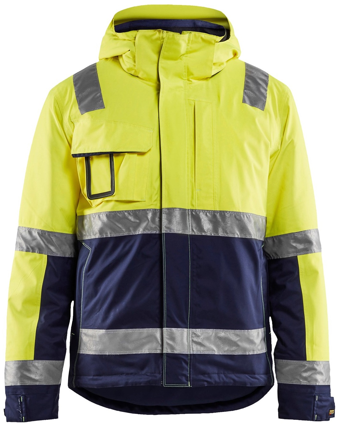 Talvitakki erittäin kestävällä hengittävällä, tuulen- ja vedenpitävällä materiaalilla. Teipatut saumat. Tumma kangas on sijoiteltu helposti likaantuville alueille. Takissa on tilavat ja toimivat taskuratkaisut - etutaskut, rintatasku vetoketjulla, kynä- ja puhelintasku sekä iso povitasku pienemmällä lisätaskulla. Sisääntaitettava ID-henkilökorttitasku. Säädettävä alareuna ja pidennetty selkäosa, joka suojaa alaselkää kylmältä ja viimalta.