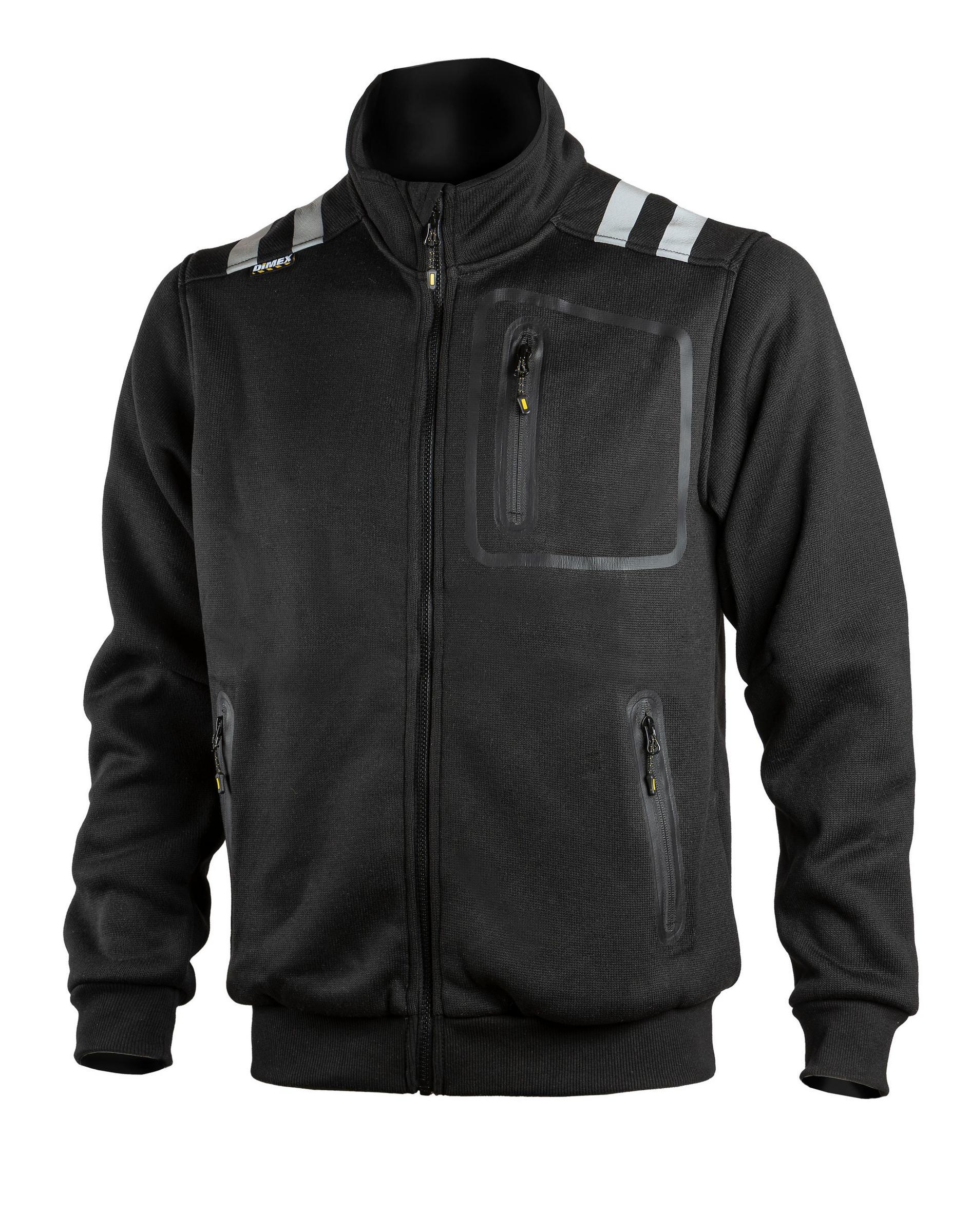 Tässä mustassa neulostakissa on Dimexin tuotteille tyypillistä särmää ja ryhtiä. Takki sopii tekijätyypille, joka hoitaa hommat ammattilaisen ottein.