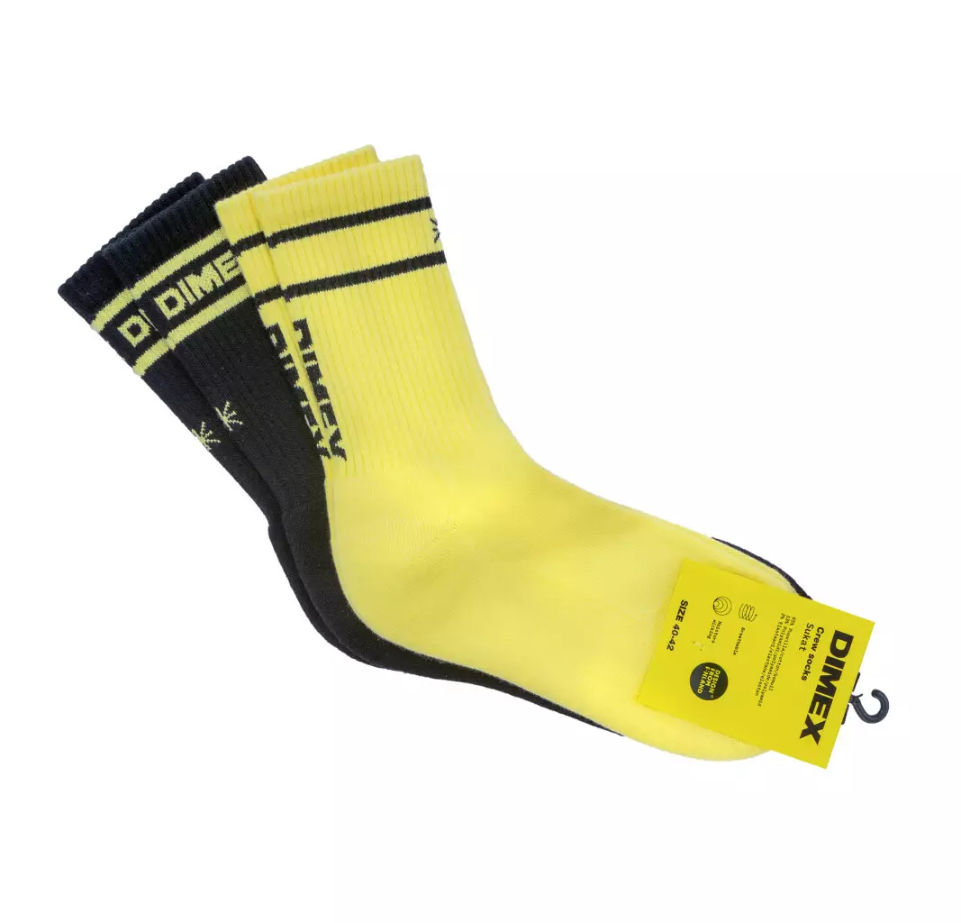 Kahden sukkaparin paketti kestäviä Dimex sukkia. Värinä mustat ja keltaiset. Vahvistettu pohja ja kanta kestävät kovempaakin käyttöä. Tyylikkäät Dimex brändäykset varressa.