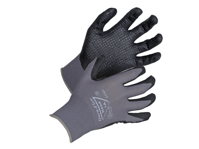 Nitriilipinnoitettu ohut työkäsine jossa tartuntanäppylät.